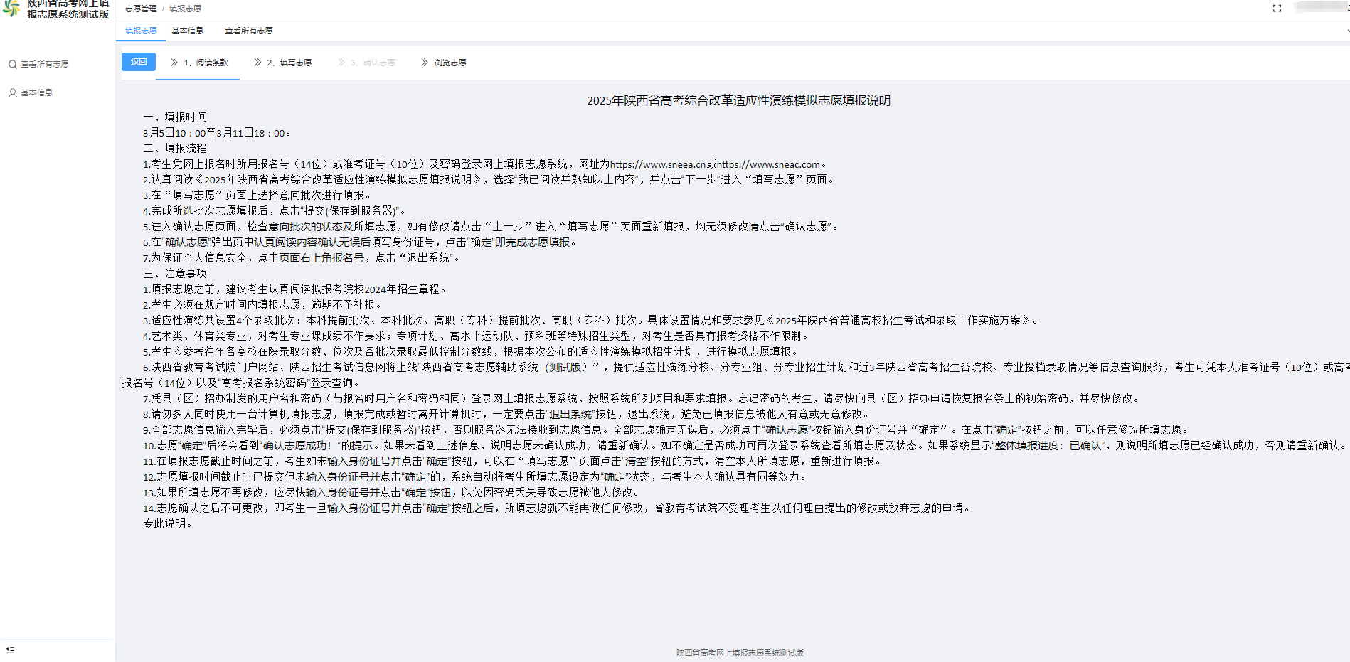 2、认真阅读《陕西省高考综合改革适应性演练模拟志愿填报说明》,选择“我已阅读并熟知以上内容”,并点击"下一步"进入“填写志愿”页面。