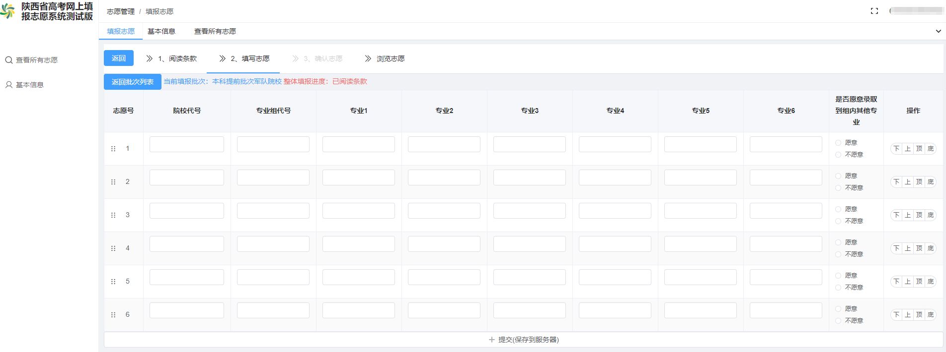 4、完成所选批次志愿填报后,点击“提交(保存到服务器)”。