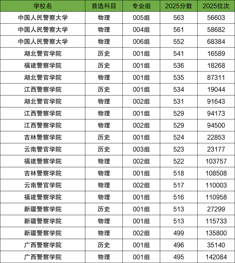 2025年录取分最低的是广西警察学院001组(496分),较为好考的还有新疆警察学院001组(513分)、云南警官学院003组(523分)。