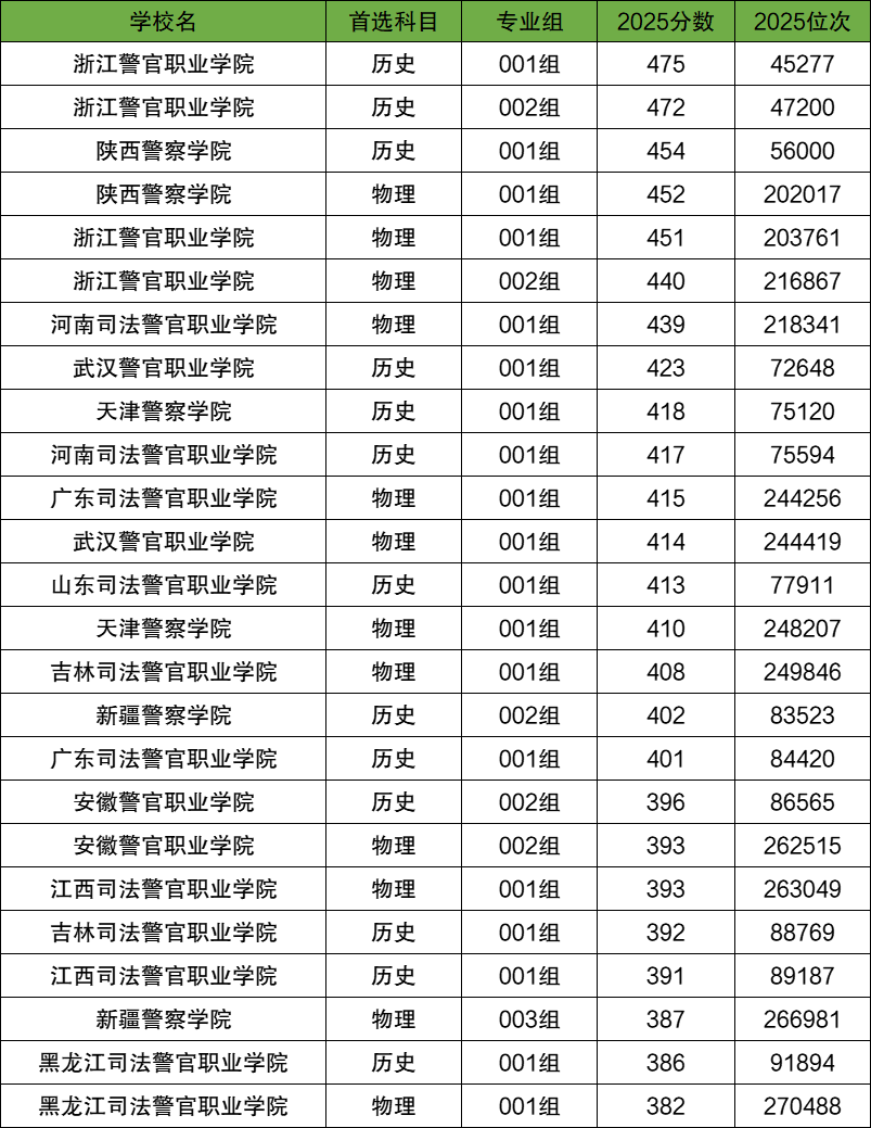 在物理类中,警校录取分最高的是陕西警察学院001组,2025年的投档线是452分;录取分最低的是黑龙江司法警官职业学院001组,2025年的投档线是382分。