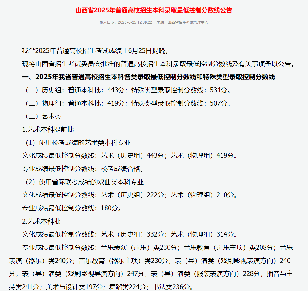 2025年山西高考分数线为:特控线为534分、本科为443分、专科为100分,此为历史类批次线。 关于2025山西高考更多分数线及一分一段表详情,本文都进行了整理,供查阅。