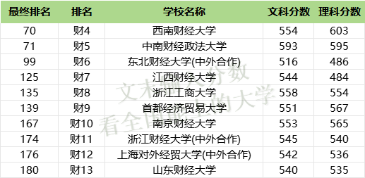 2024年全国大学排名第54,财经大学排名第3,最低分为理科623分、文科607分。