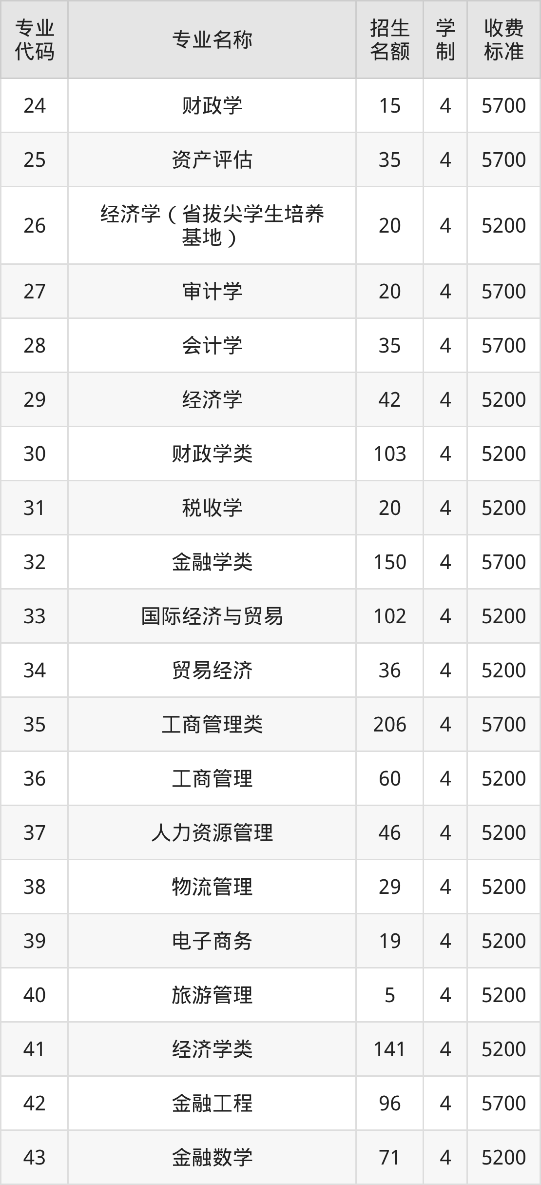 南京财经大学财政学专业在本科批历史类招15人,学制4年,专业招生代码是01,学费是5700元一年。南京财经大学经济学专业在本科批历史类招15人,学制4年,专业招生代码是02,学费是5200元一年。