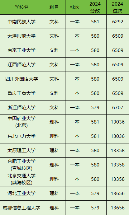 其中文科2024年分数线刚好是580分的有天津师范大学、南京工业大学、江西师范大学、四川外国语大学和重庆工商大学;理科2024年分数线刚好是580分的有太原理工大学、和合肥工业大学(宣城校区)。