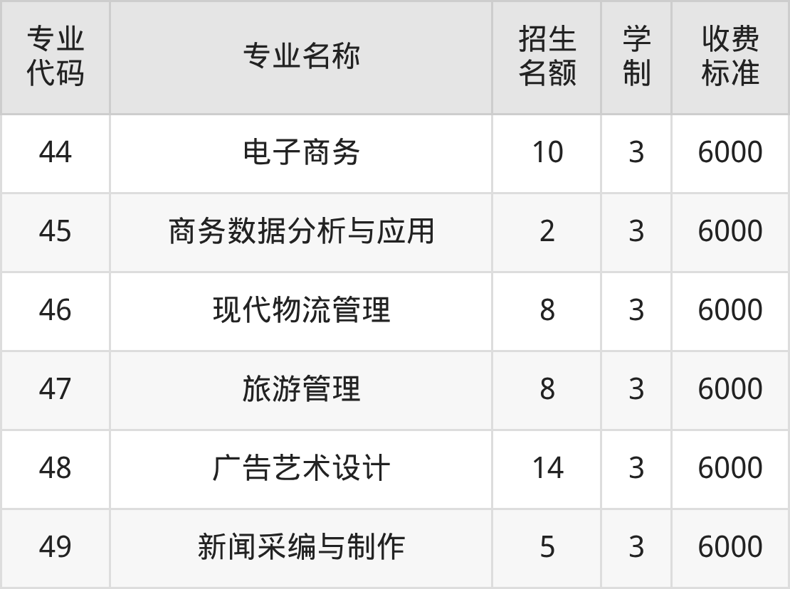 | 专业 代码 | 专业名称 | 招生 名额 | 学 制 | 收费 标准 |