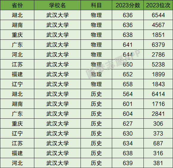 武汉大学在3+1+2新高考地区物理科目分数最低为湖北的636分,历史科目分数最低为湖北的564分。