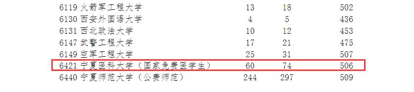 在宁夏教育考试院公布的提前录取第一批院校本科投档信息中,免费医学生院校只有1所,投档线如下: