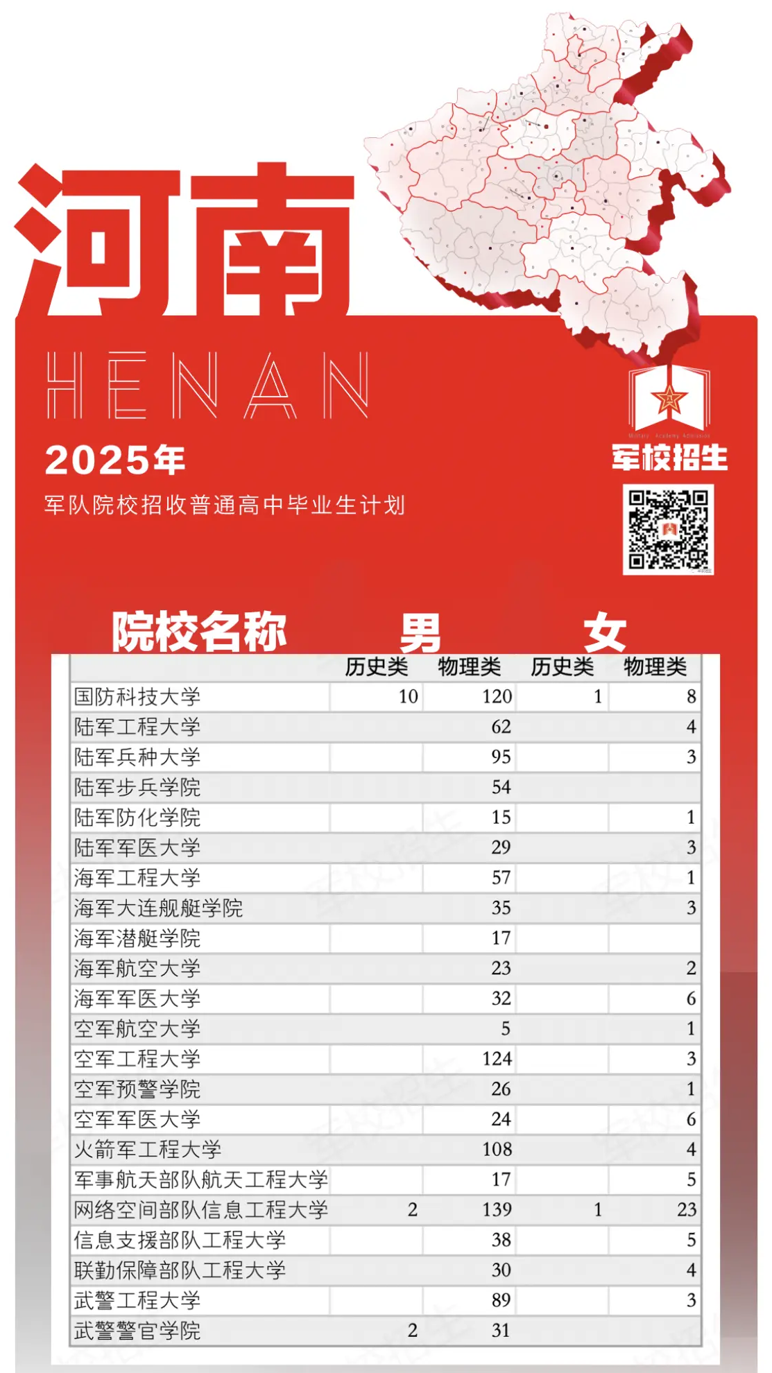 但是在河南招生的军校不止上述1所,根据2025年的招生计划来看,在河南招生的军校包括国防科技大学、武警工程大学、海军航空大学等22所,具体名单如下: