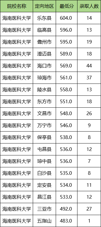 2024年海南医科大学面向海南省18个市(县)招生,各地的报考最低分如下: