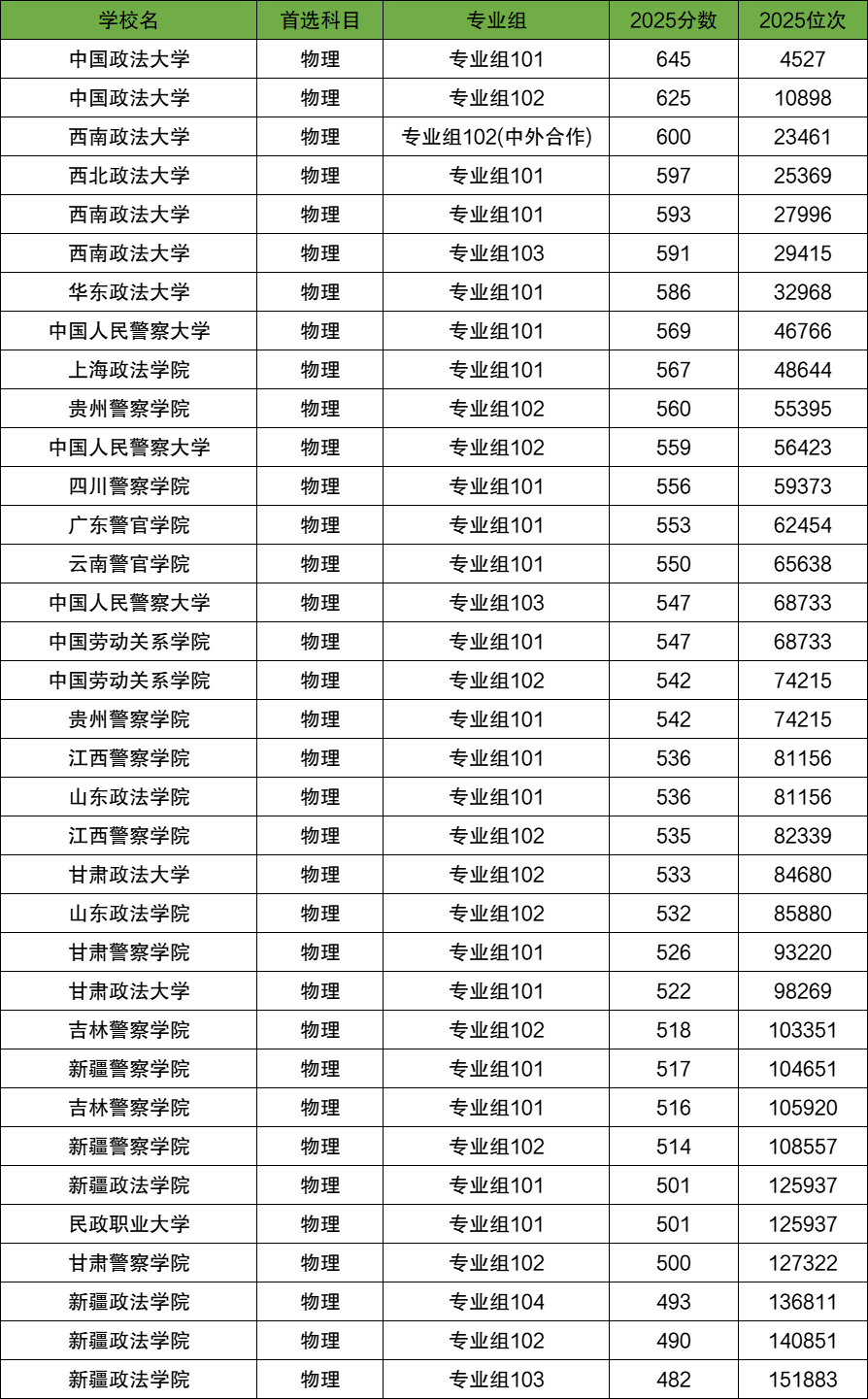 全国政法类大学2025年在四川物理类录取分数线最高的院校专业组是中国政法大学(专业组101),学校2025年最低投档分645分,最低位次为4527名。