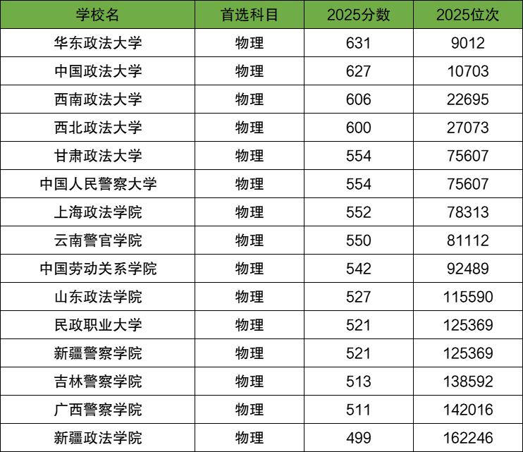 除此之外,录取分数线较高的政法类院校有:中国政法大学627分、西南政法大学606分、西北政法大学600分、甘肃政法大学554分、中国人民警察大学554分等。