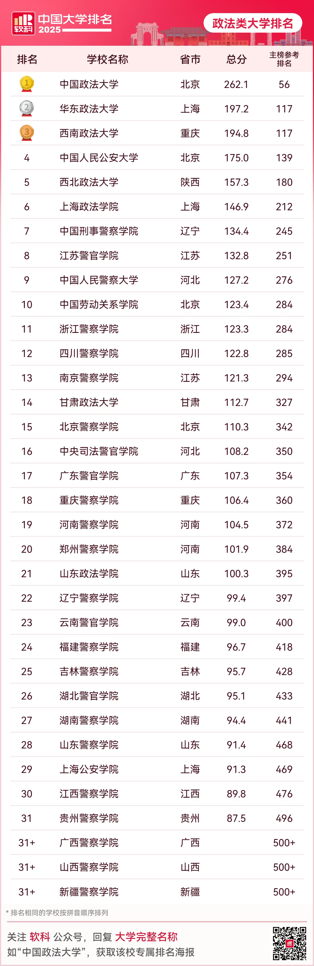 在2025年软科最新发布的中国政法类大学排名中,中国政法大学(全国排名第56名),在2025中国政法类大学排名第一。华东政法大学(全国第117名)排名第二,西南政法大学(第117名)排名第三。