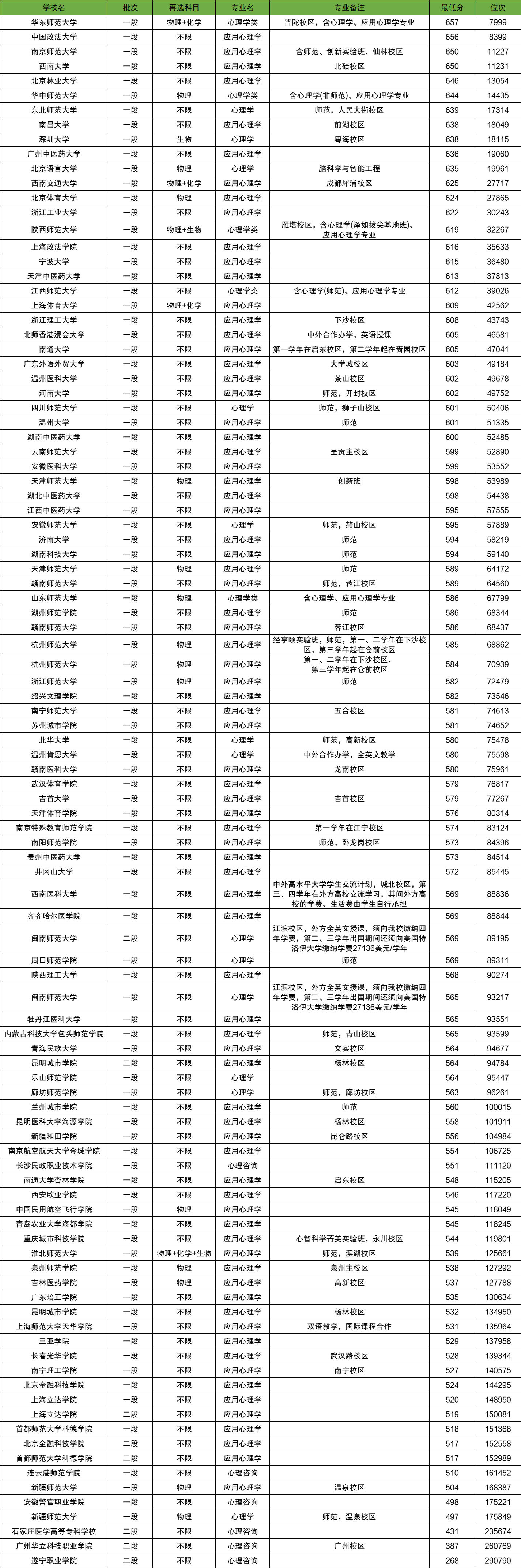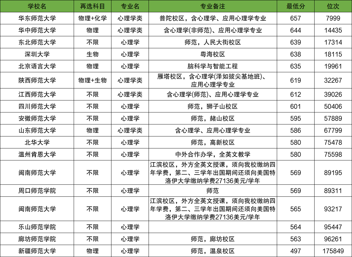 其次是华中师范大学心理学类(含心理学(非师范)、应用心理学专业)644分、东北师范大学心理学639分、深圳大学心理学638分。