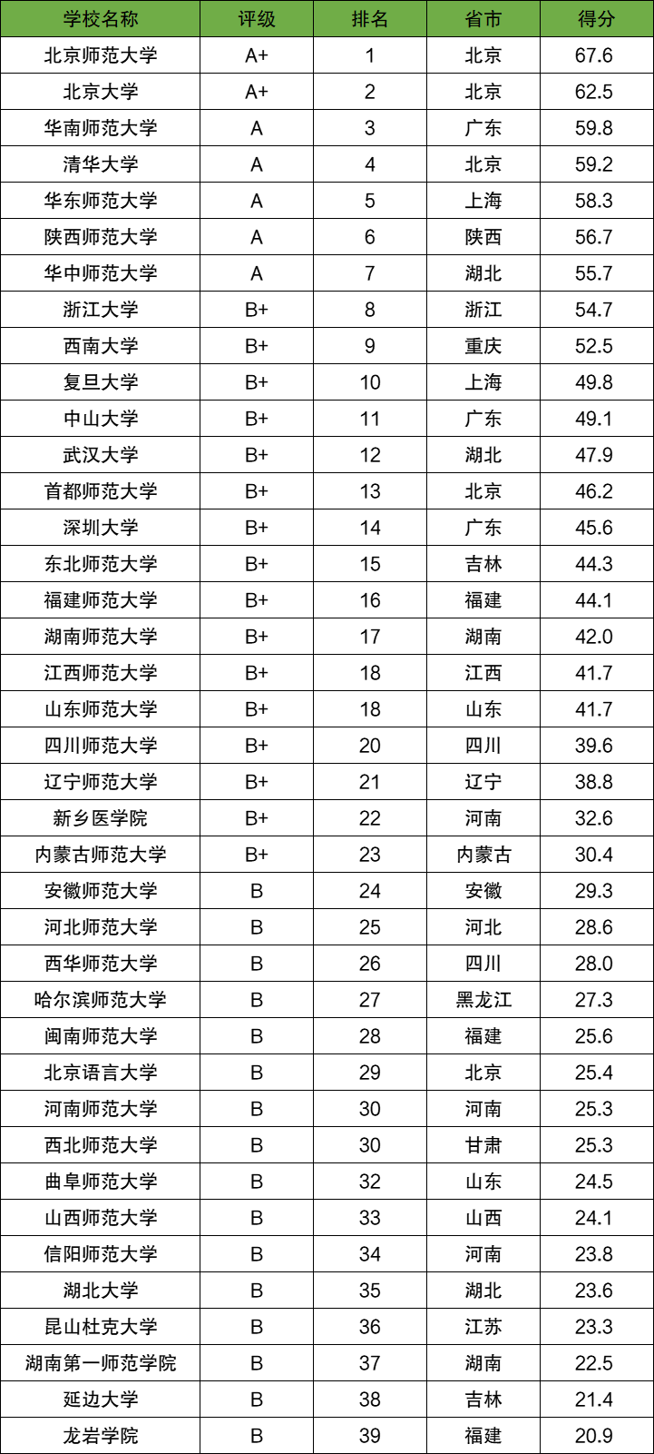 北京师范大学、北京大学、华南师范大学、清华大学、华东师范大学、陕西师范大学、华中师范大学、浙江大学、西南大学、复旦大学。
