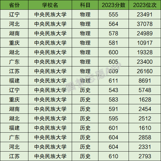 中央民族大学在3+1+2新高考地区物理科目分数最低为辽宁的555分,历史科目分数最低为辽宁的543分。