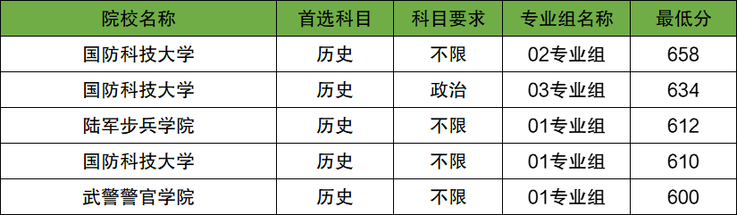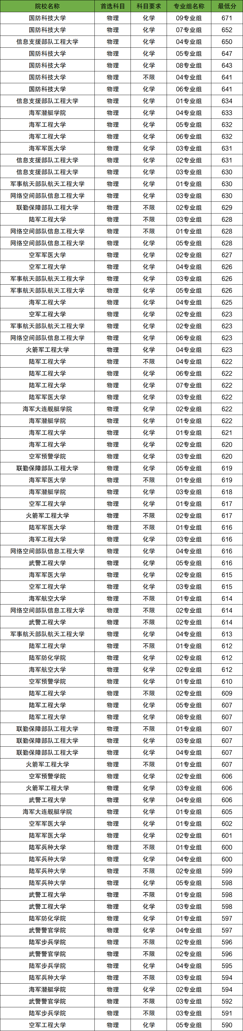 其他录取分数线较高的军校有:国防科技大学(07专业组)652分、信息支援部队工程大学(04专业组)650分、海军潜艇学院(04专业组)633分、海军工程大学(05专业组)632分、海军军医大学(03专业组)631分等。