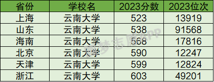 云南大学在3+3新高考地区分数最低为上海的523分。