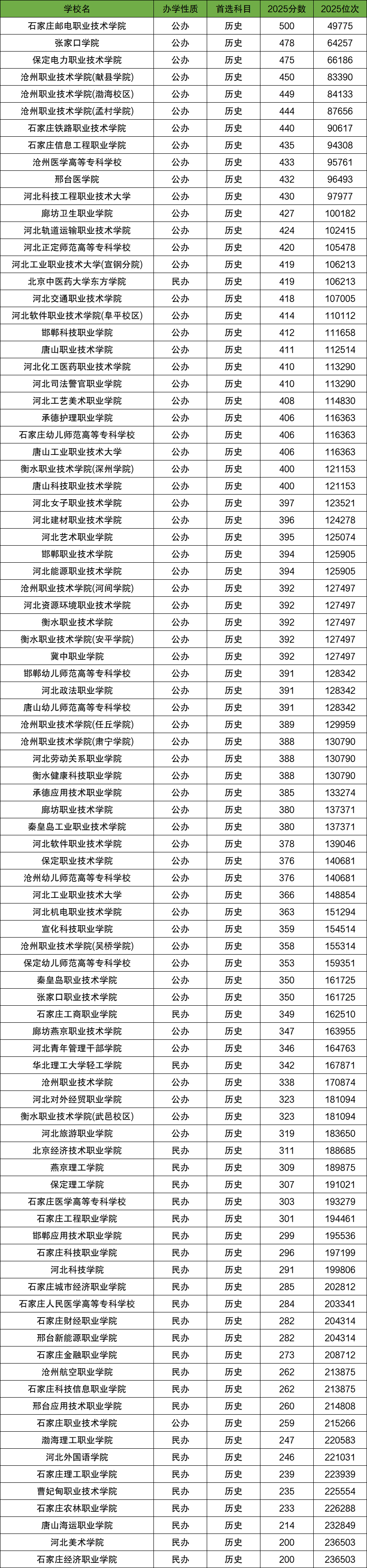 而2025年河北历史类专科批中收分最低的是石家庄经济职业学院和河北美术学院,2025年的分数线为200分,最低位次为236503位。