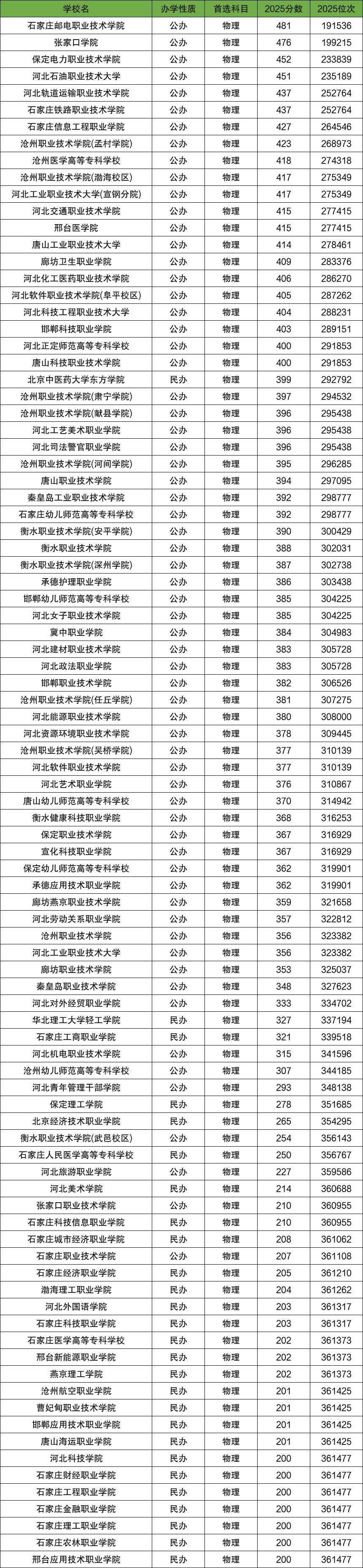 2025年在河北物理类专科批中收分最高的是石家庄邮电职业技术学院,2025年的分数线为481分,位次为191536位,其次就是张家口学院,2025年的分数线为476分,位次为199215位;