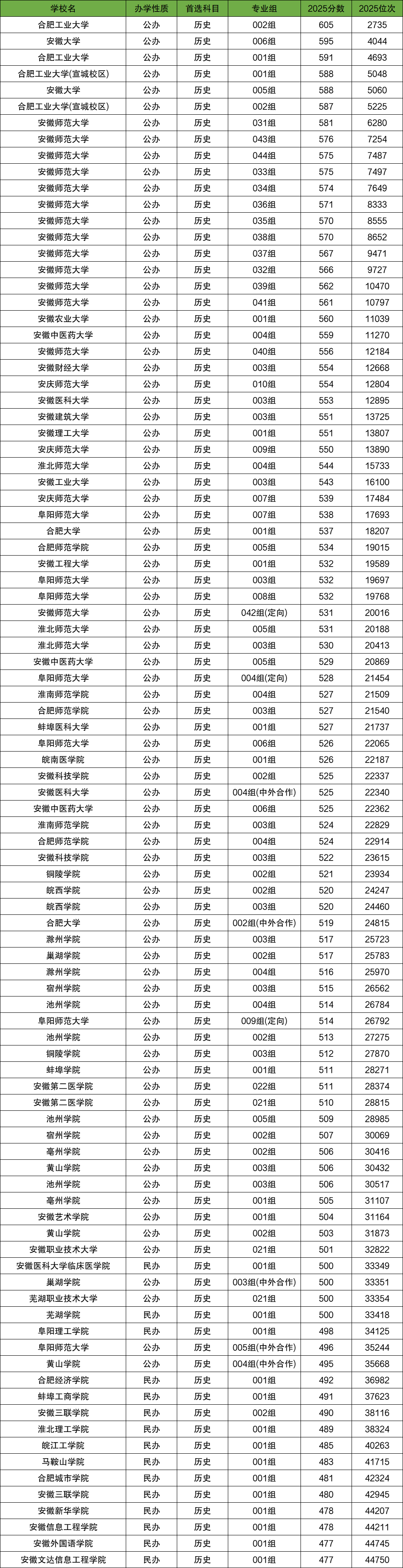 而2025年安徽历史类本科批中收分最低的是安徽文达信息工程学院001组、安徽外国语学院001组,2025年的分数线均为477分,最低位次为44750位。