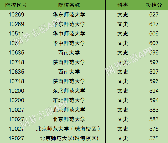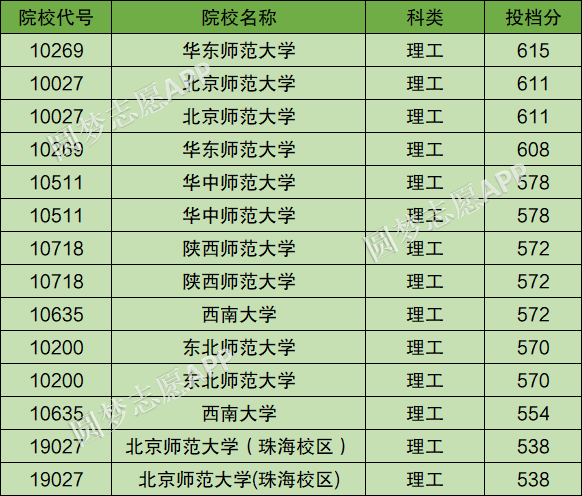 东北师范大学:594分、陕西师范大学:596分、西南大学:597分、华中师范大学:607分、北京师范大学(珠海校区):575分、华东师范大学:627分、北京师范大学:583分。