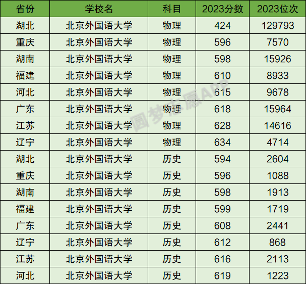 北京外国语大学在3+1+2新高考地区物理科目分数最低为湖北的424分,历史科目分数最低为湖北的594分。