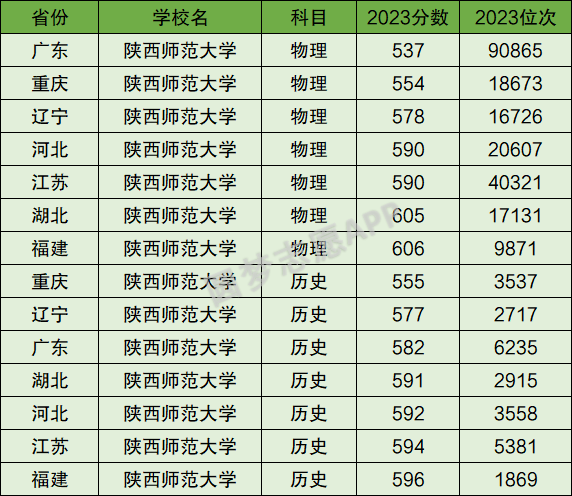 陕西师范大学在3+1+2新高考地区物理科目分数最低为广东的537分,历史科目分数最低为重庆的555分。