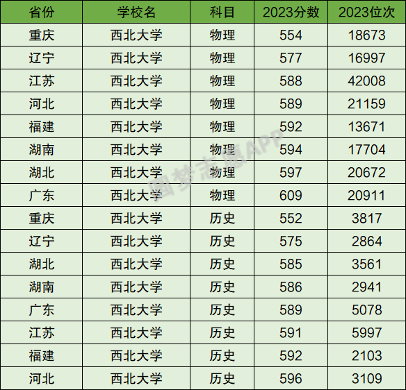西北大学在3+1+2新高考地区物理科目分数最低为重庆的554分,历史科目分数最低为重庆的552分。