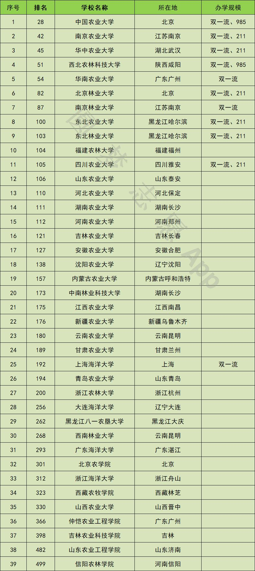 在这39所农林类大学中,中国农业大学、西北农林科技大学为985工程建设高校;南京农业大学、华中农业大学、北京林业大学、东北农业大学、东北林业大学、四川农业大学为211建设高校;华南农业大学、南京林业大学、上海海洋大学三所为双一流建设高校。