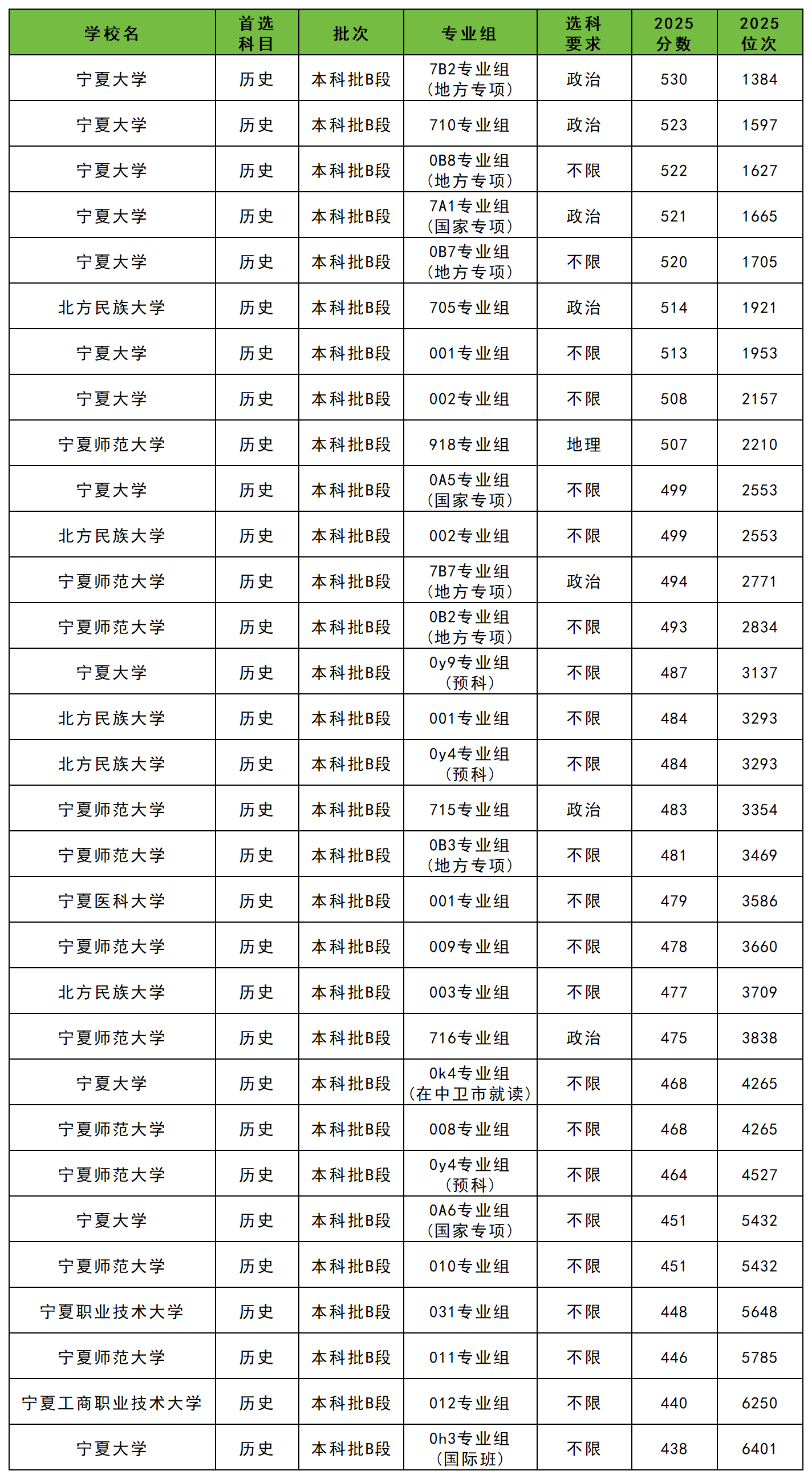 宁夏历史类录取分数最低公办本科大学是宁夏大学0h3专业组(国际班),最低分为438分,历史类分数线相对较低的还有: