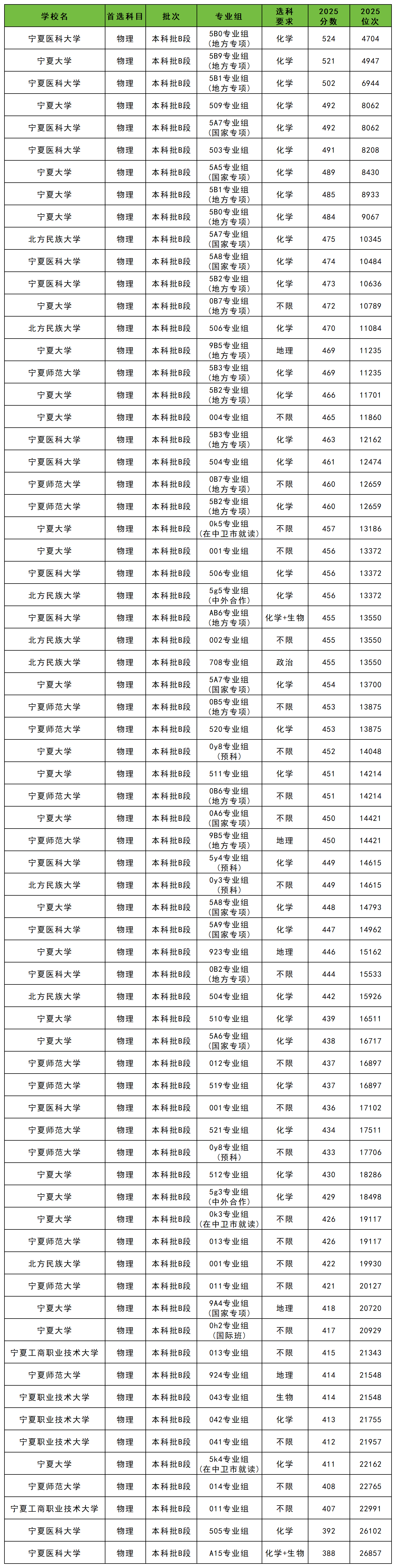 (1)宁夏医科大学,505专业组,2025最低分为392分;