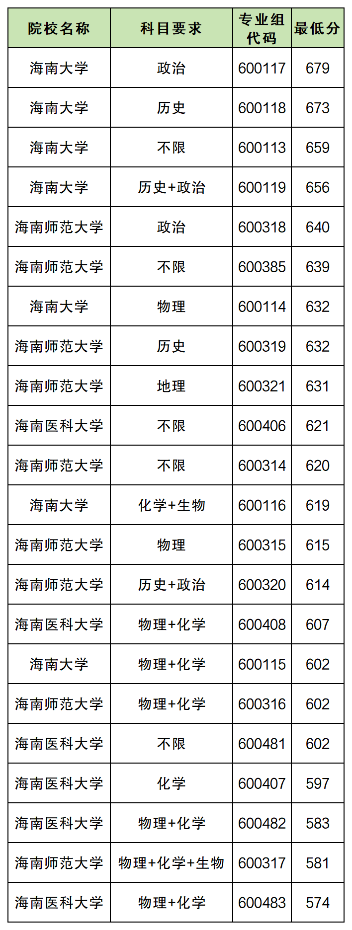 海南大学(13组659分)、海南师范大学(18组640分)、海南师范大学(21组631分)等。