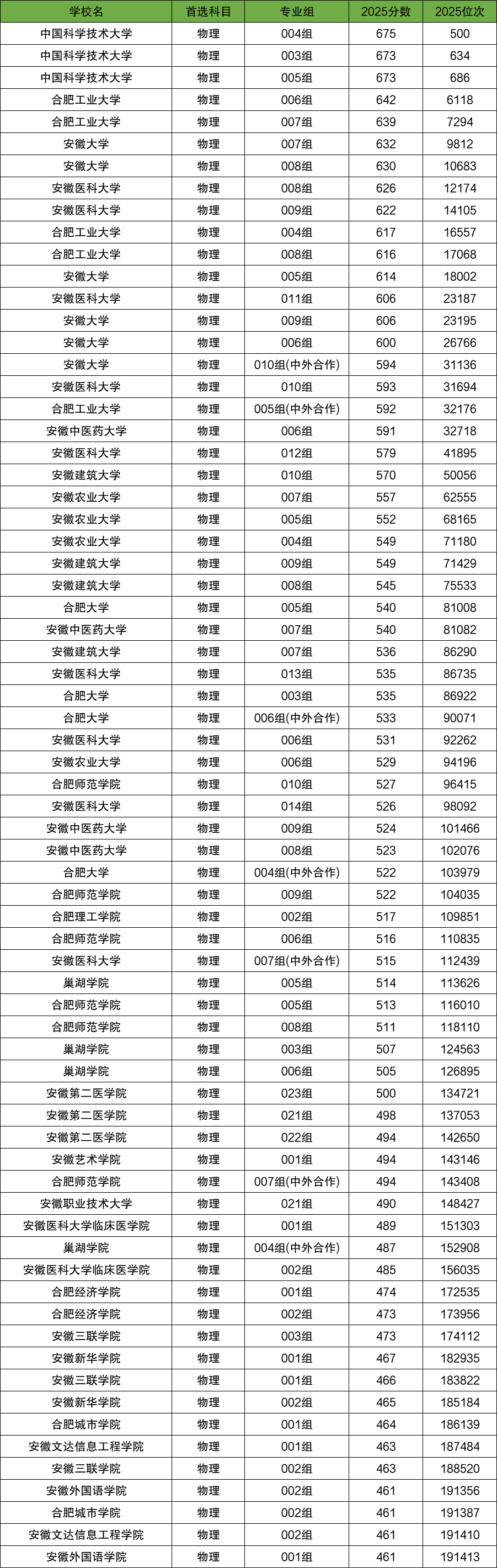 2025年合肥本科各大学专业组录取分数线(物理类):