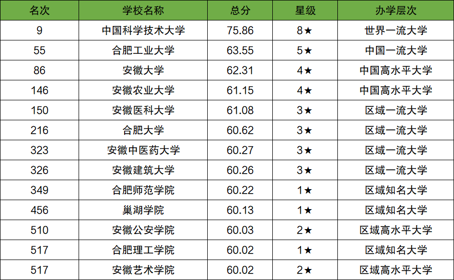 注:本文整理出的合肥各大学排名均为合肥公办本科院校的排名。