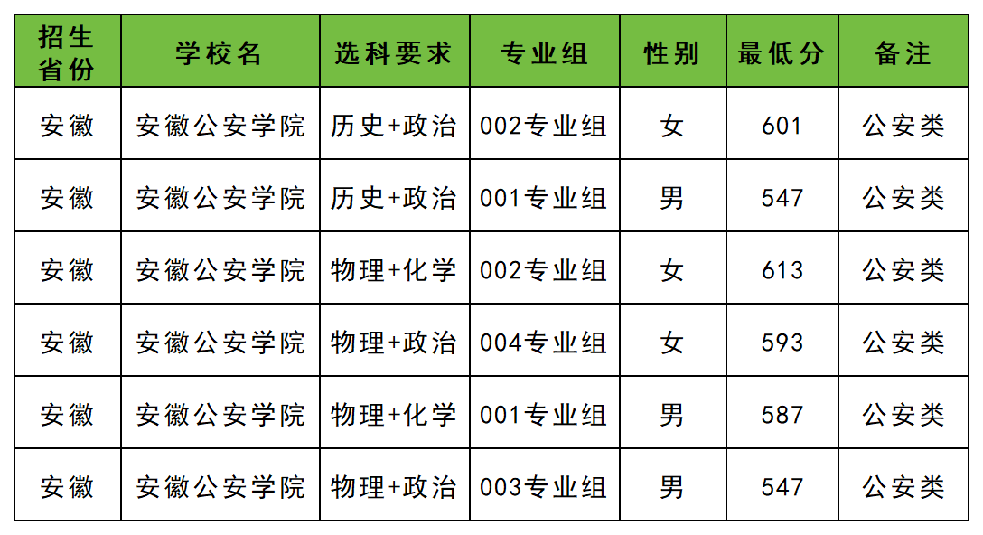 如2025年安徽公安学院在安徽省物理类招生最低分为547分,历史类招生最低分也是547分。