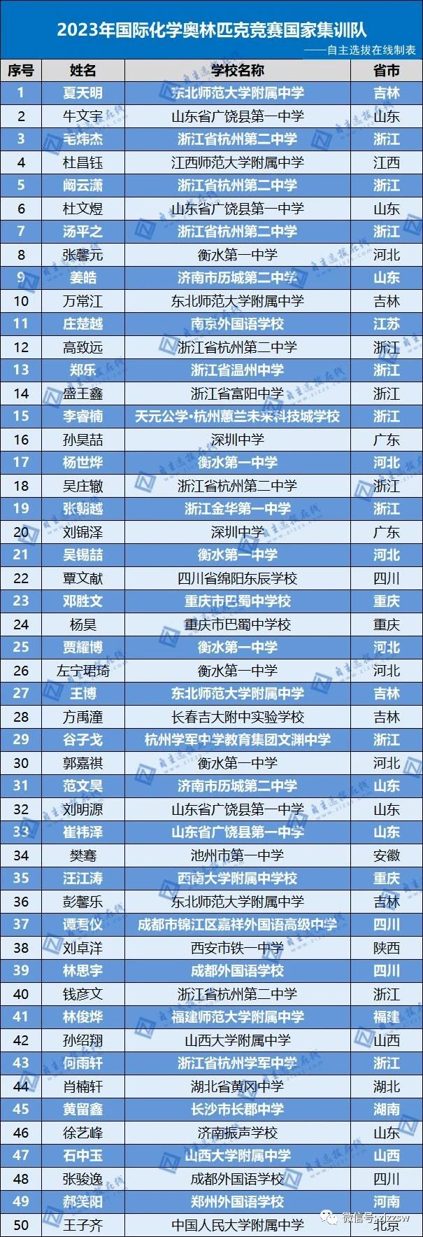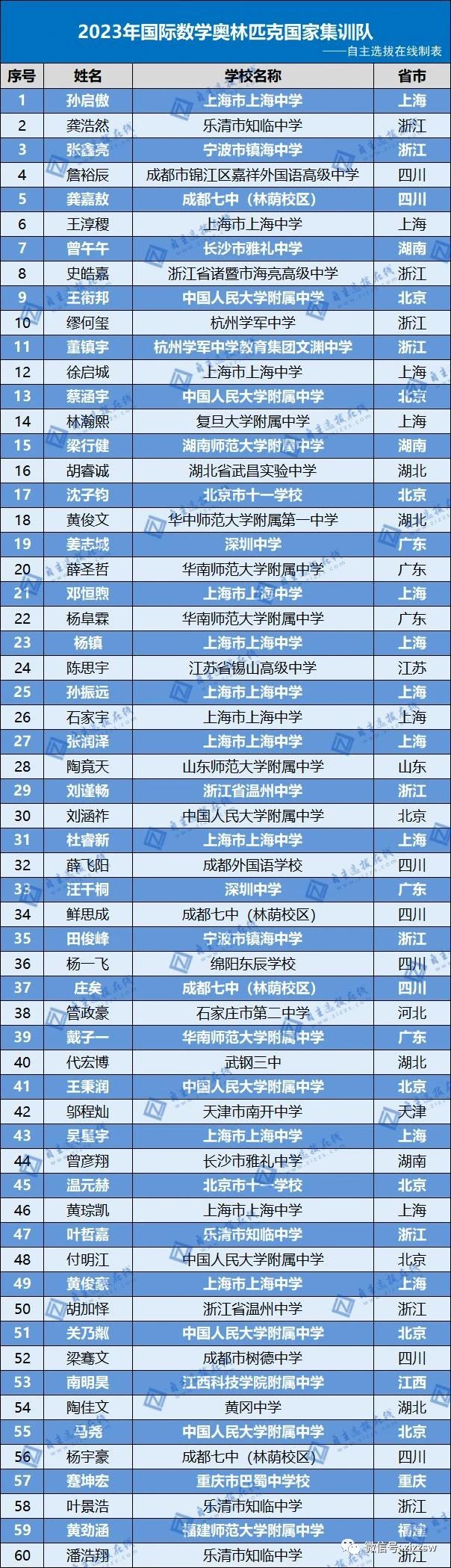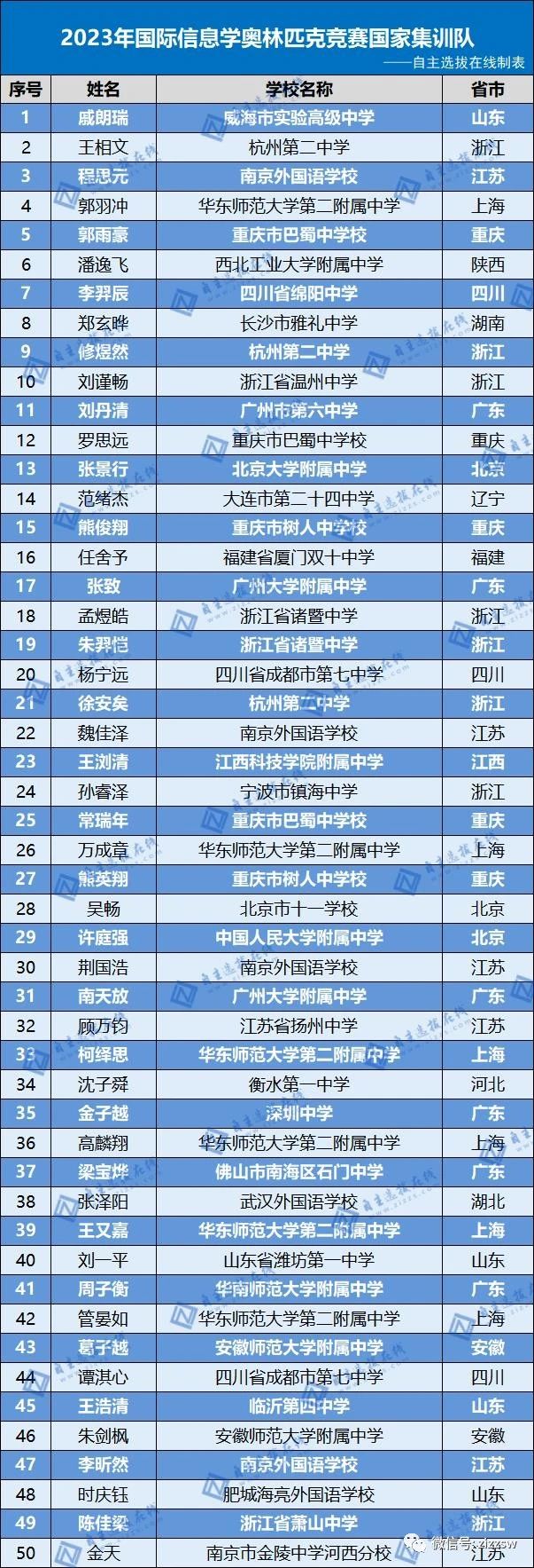 在这五大学科国家集训队名单中,一共有259人入选,其中比较特殊的是浙江省温州中学的刘谨畅,他为数学、信息学双国集,也就是说进入了数学和信息学两个国家集训队之中。