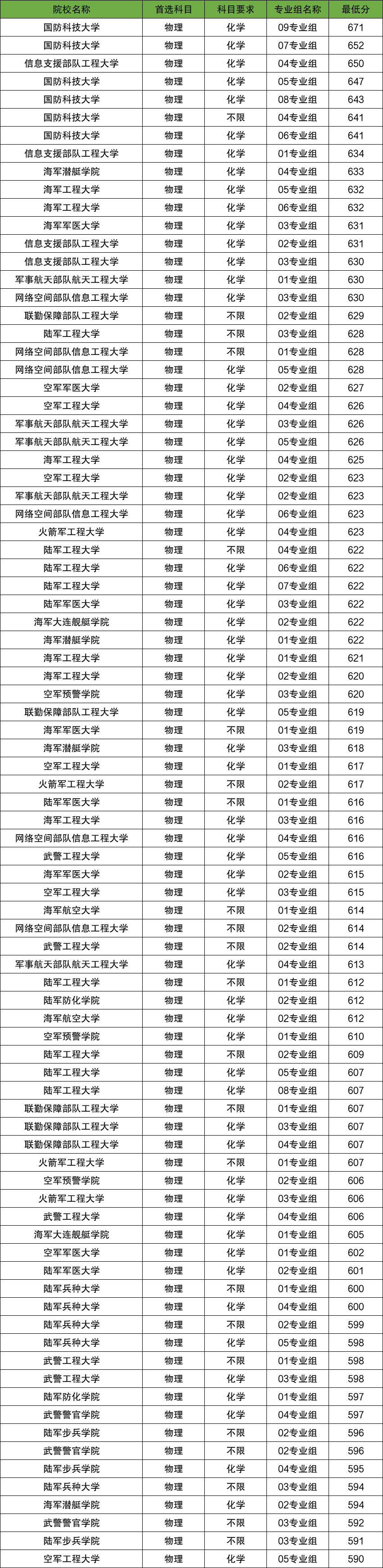 分数最高的专业组是国防科技大学09专业组(671分),军校的最低录取线是590分,是空军工程大学05专业组。