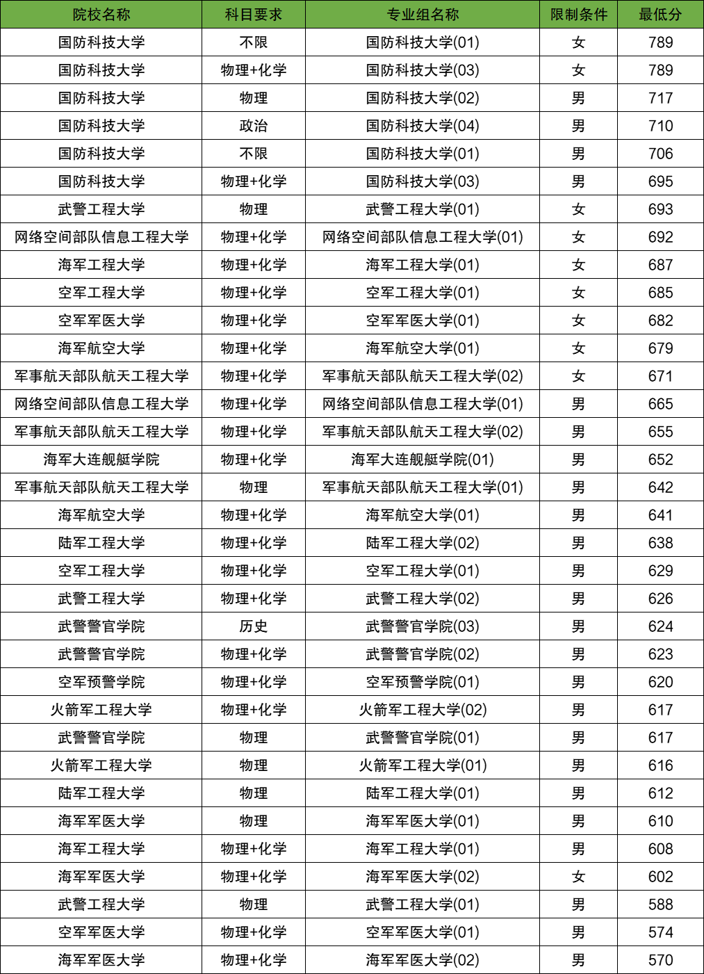 在女生方面,最高分专业组是国防科技大学01组(不限),录取线是789分。最低分军校专业组是海军军医大学02组(物理+化学),2025年的投档线是602分。