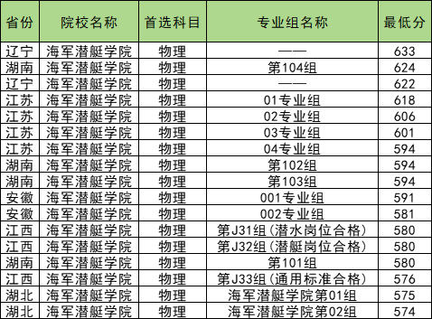 2025年海军潜艇学院湖北最低录取分数线:物理类574分。物理类收分最低的专业组是第02组、收分最高的专业组是第01组。