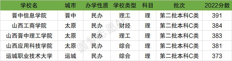 山西省理科分数最高的五所民办本科大学为晋中信息学院(391分)、山西工商学院(384分)、山西晋中理工学院(383分)、山西应用科技学院(381分)、运城职业技术大学(373分),以下为2022年山西省理科所有民办本科大学分数线