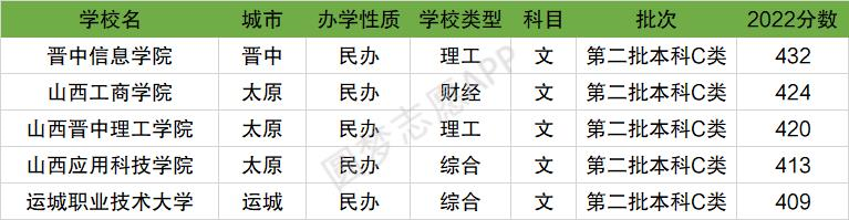 山西省文科分数最高的五所民办本科大学为晋中信息学院(432分)、山西工商学院(424分)、山西晋中理工学院(420分)、山西应用科技学院(413分)、运城职业技术大学(409分),以下为2022年山西省文科所有民办本科大学分数线