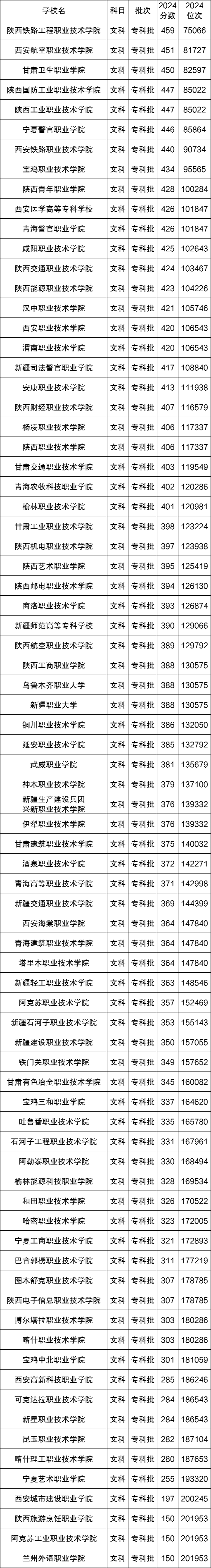 下面是2024年各西北地区的高职专科院校在四川省文科的录取分数线(供参考):