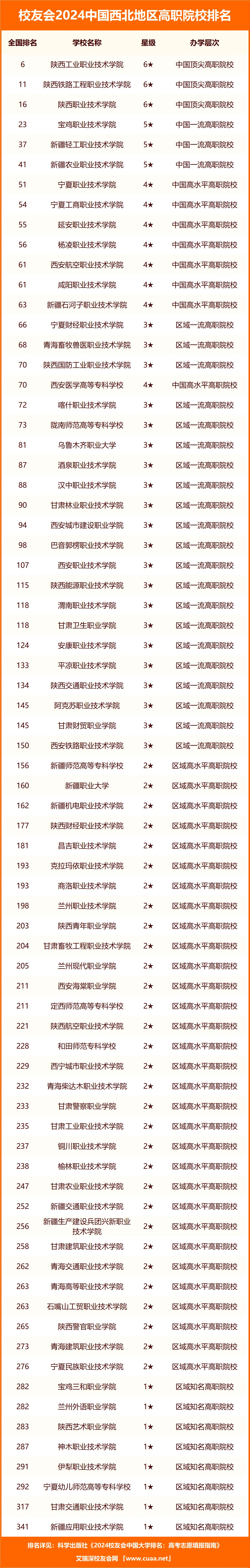 根据校友会2024年西北地区的高职专科院校排名表,可以得知国内排名前10的西北地区的高职专科院校分别是: