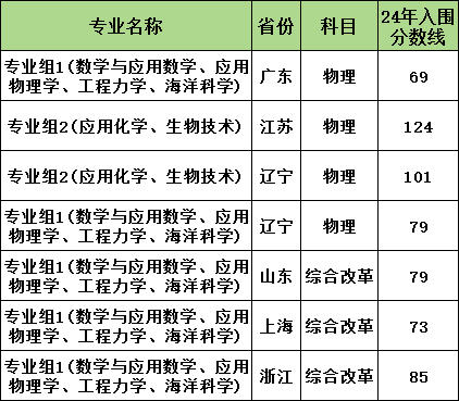 (1)专业组1(数学与应用数学、应用物理学、工程力学、海洋科学)专业入围分数线