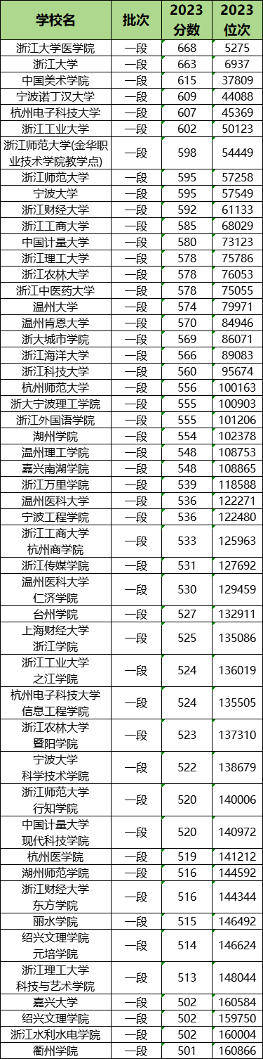 根据浙江省教育考试院公布的数据,圆梦志愿为大家整理了浙江省内所有一本大学2023年在浙江省的分数线排名汇总表。其中,浙江大学医学院在浙江一段线中的分数线最高,2023年的最低分为668分、最低位次为5275名。