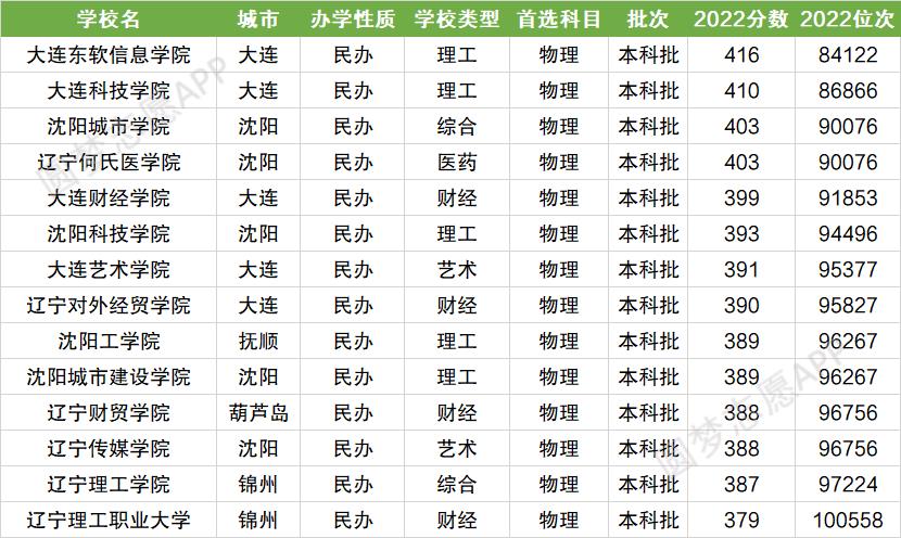 辽宁省物理类分数最高的五所民办本科大学为大连东软信息学院(416分)、大连科技学院(410分)、沈阳城市学院(403分)、辽宁何氏医学院(403分)、大连财经学院(399分),以下为2022年辽宁省物理类所有民办本科大学分数线