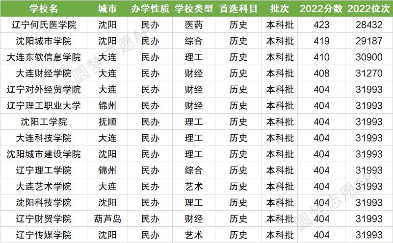 辽宁省历史类分数最高的五所民办本科大学为辽宁何氏医学院(423分)、沈阳城市学院(419分)、大连东软信息学院(410分)、大连财经学院(408分)、辽宁对外经贸学院(404分),以下为2022年辽宁省历史类所有民办本科大学分数线