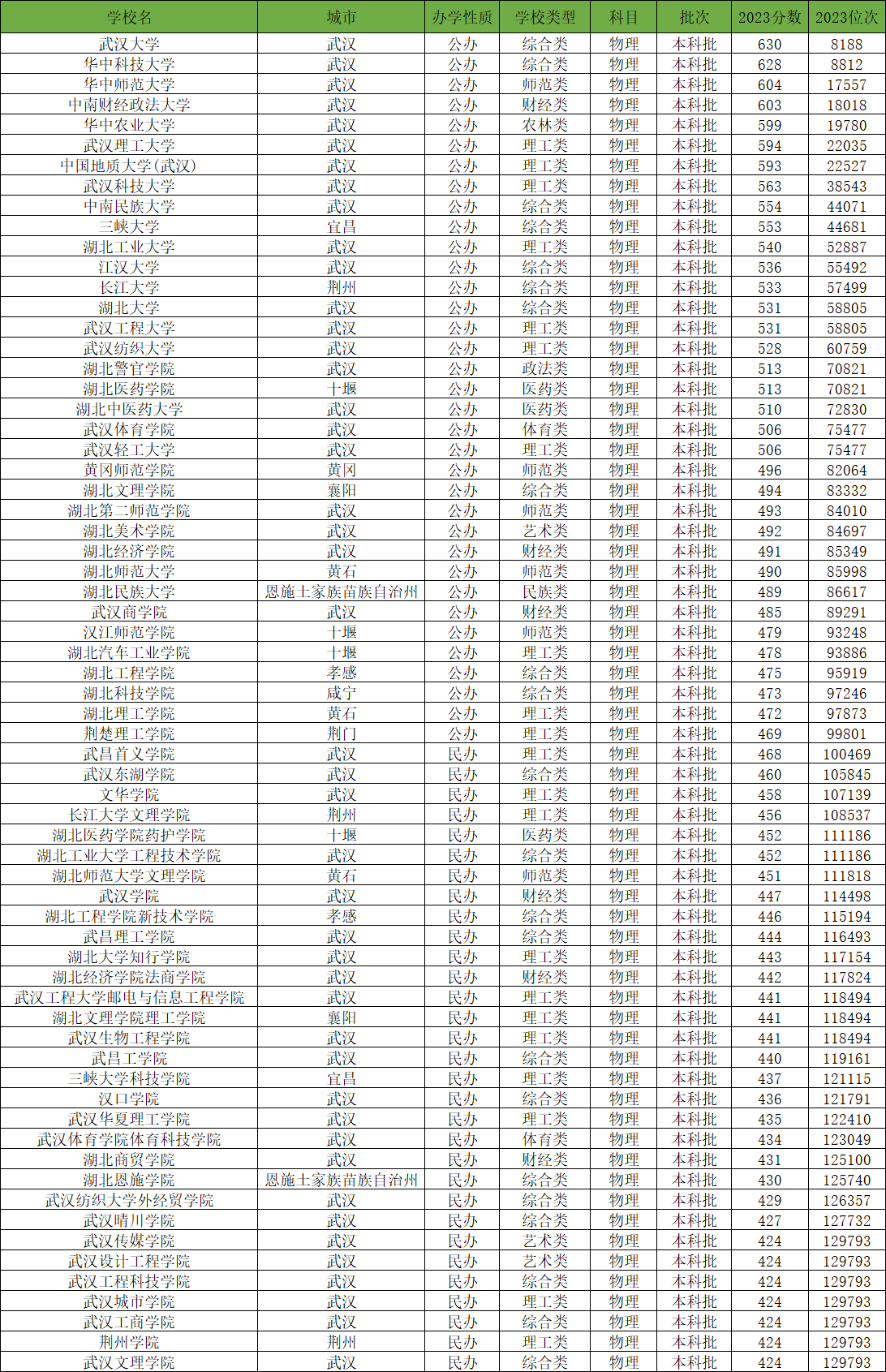 湖北物理类考生想上本科大学至少需要424分,想上公办本科大学需要469分。