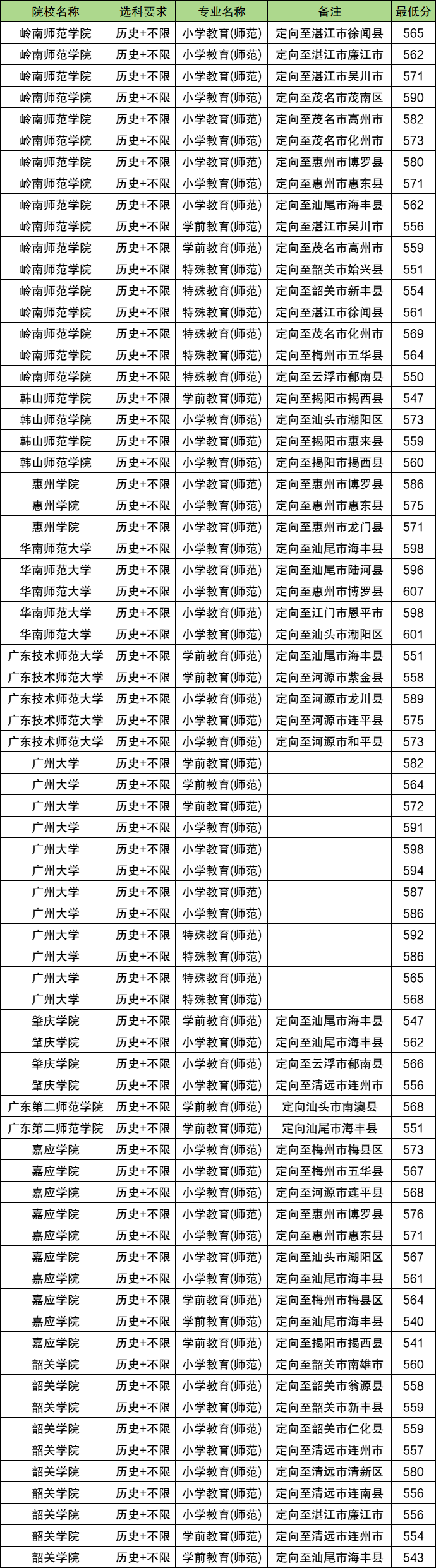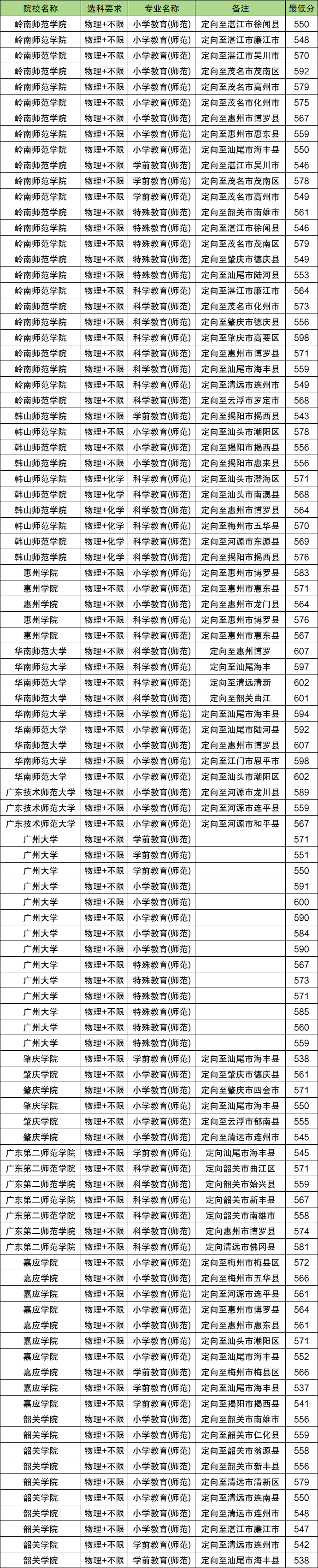 广州大学:最低分550分,专业为特殊教育(定向至揭阳市揭西县)和小学教育(定向至清远市连州市)。