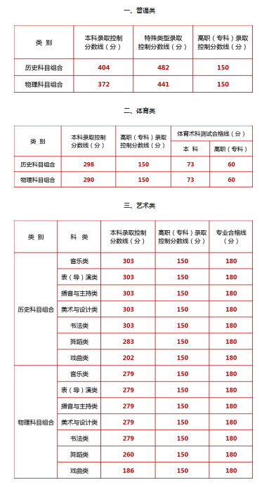 本科院校录取控制分数线404分;特殊类型录取控制分数线482分;高职(专科)录取控制分数线150分。